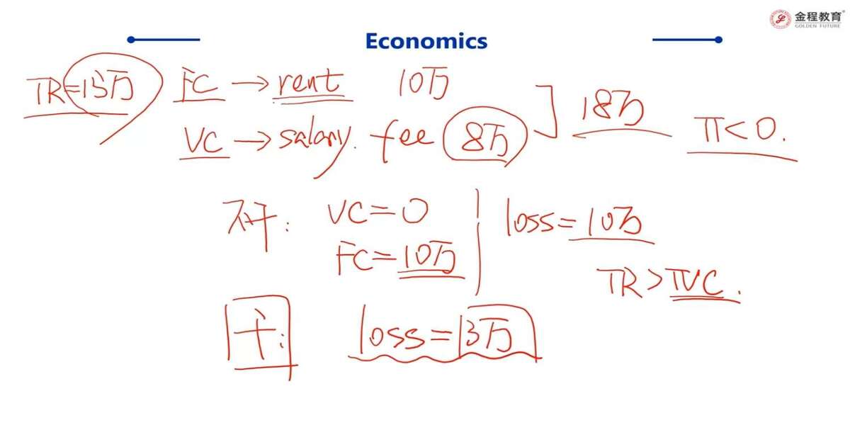 老师讲解的这开培训班的例子中,他说道当TR时15万,VC是8万,FC是 10万,TR-TC=-3万;当此时不干了,老师说损失是10万,我不理解为啥损失不是15万的TR减去10万FC=5万元的利润?