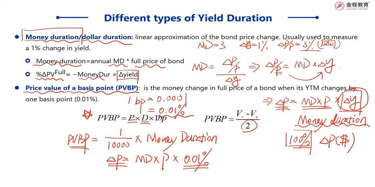 一、我总结一下固定利息债券修正久期涉及的几个公式,请老师指正:1. MD=(δP/P)/δY2. MD=(δP/δY)*(1/P)3.MD=[1/(1+Y)]*Macd4.δP/P=-MD*δY5.近似的MD=(P_-P+)/【δy*2*P)6. 因为MD=(δP/P)/δY,所以δP=MD*P*δY,money duration=MD*P7.PVBP=MD*0*1bp,PVBP=(P_-P)+/2二、我总结一下其他类型息债券麦考利久期涉及的几个公式,请老师指正:1.永续债券的MacD=(1-y)/y2.浮动利息债券MacD=(T-t)/T三、关于Macd和MD之间公式的转换,请老师指正:1. MD=【1/(1+Y)】*Macd2. Macd=MD*(1+Y)3.MD=Macd/(1+y)四、关于Macd推导MD,从而得到债券价格的变动幅度:1. 先得出MacD=权重*付息日2. 把MacD代入公式求出MD=1/(1+Y)*Macd3. 把MD代入公式求出δP/P=-MD*δY