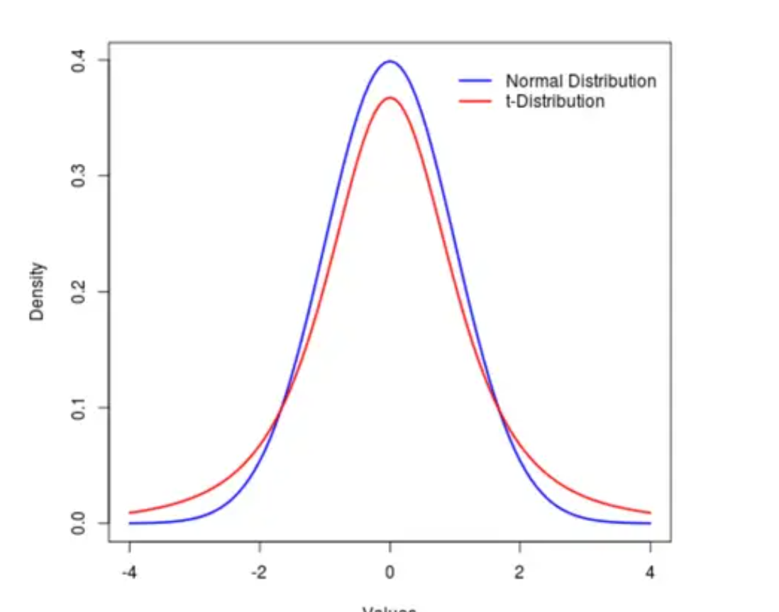 同学,你好,下图是t分布,和正态分布的图像,t 分布相比正态分布的确是低峰肥尾。