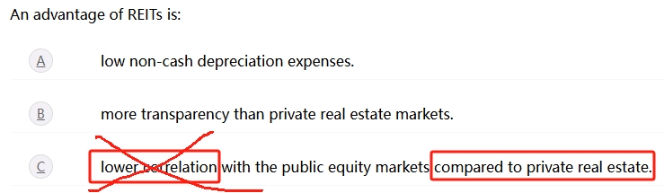 同学,你好!REITs是可以在二级市场交易的(流通性很高),和直接投资房地产相比,与公开股票投资的相关性应该是更高的,因为都属于证券类金融产品。望采纳,祝通过!