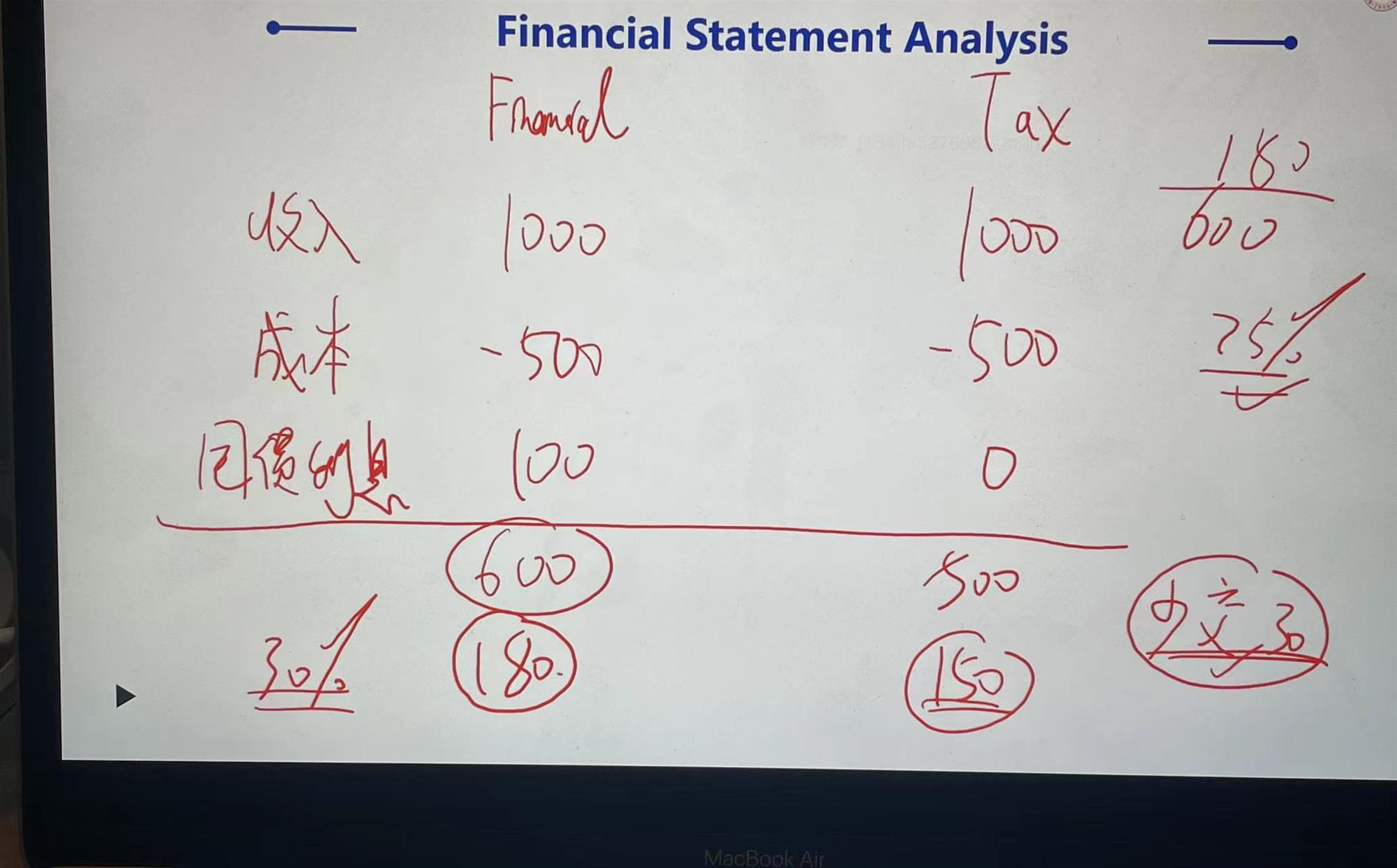 3. 举例见截图。这里30%是法定税率,会计上的EBT是600,乘以30%法定税率计算出180,这个180不是tax expense,没有实际含义。180就是用来和税法上的150(tax payable)比较的(本来是比较判断出是DTA或DTL,但因为是永久性差异,所以没有这一步,不用比较了)
