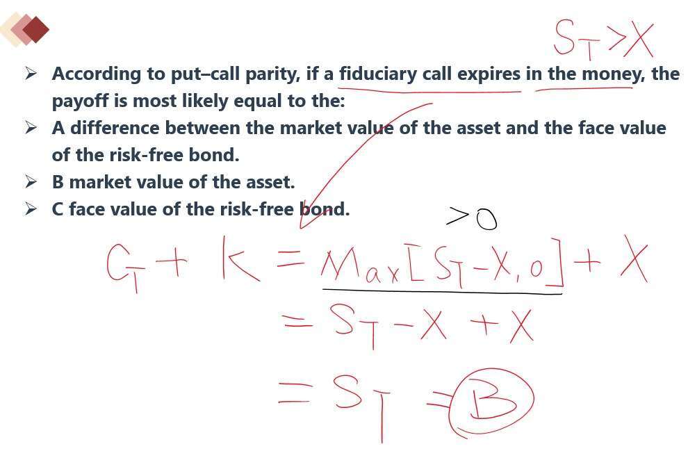 if a fiduciary call expires in the money说明c+K里的call option到期的状态是价内期权(S>X)
