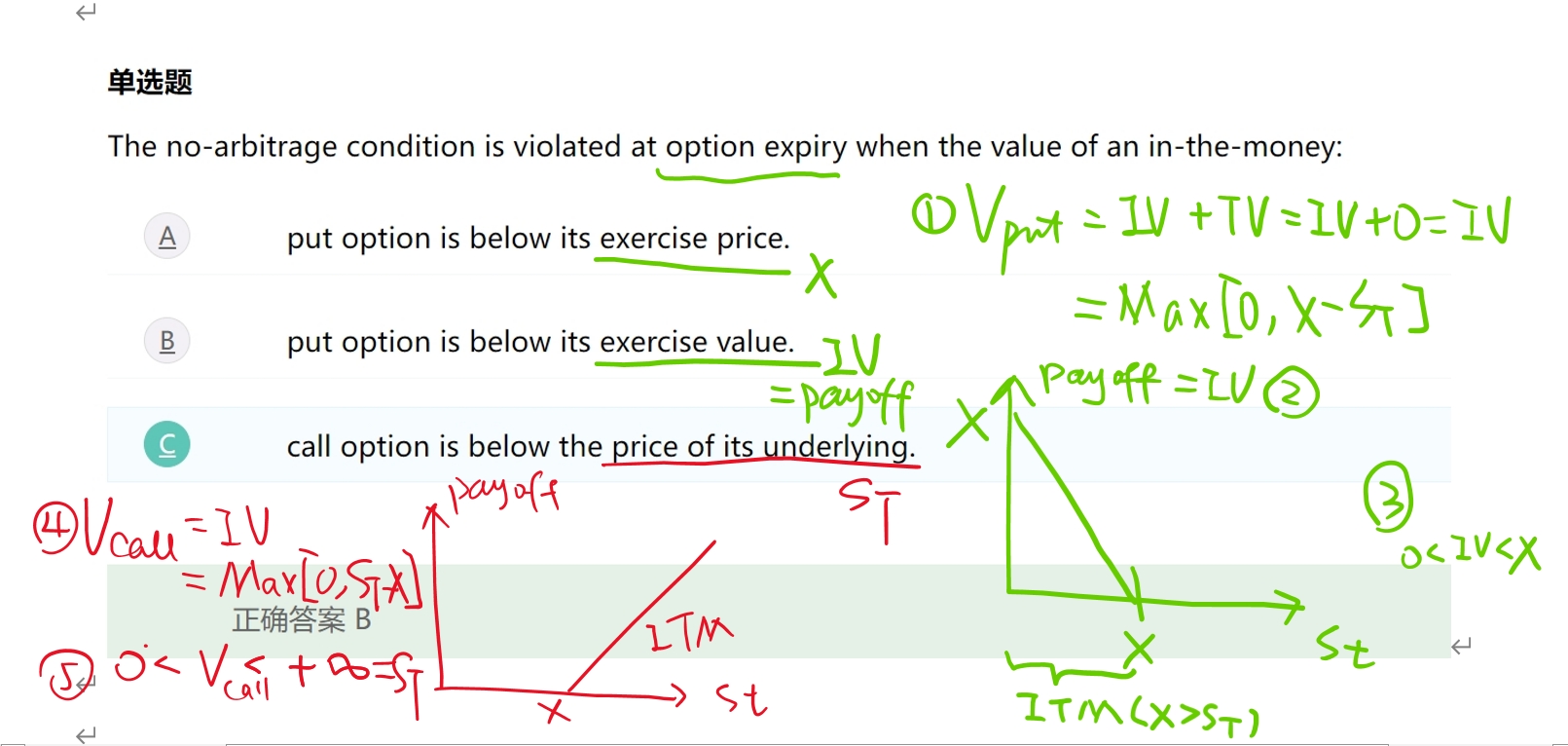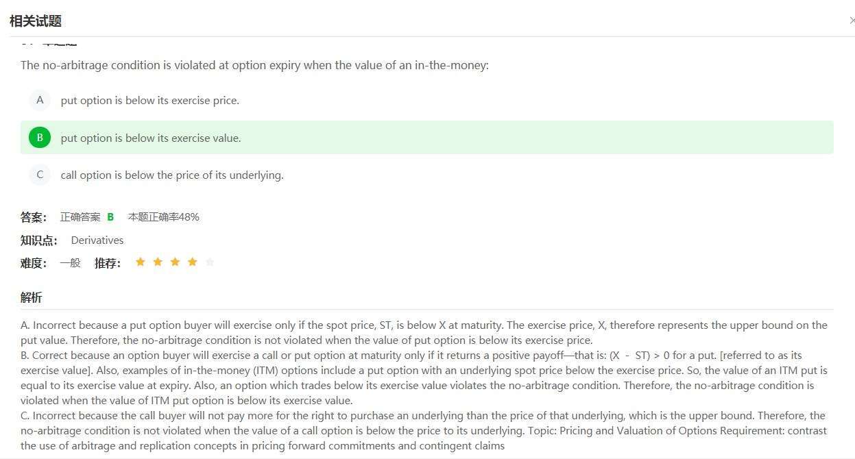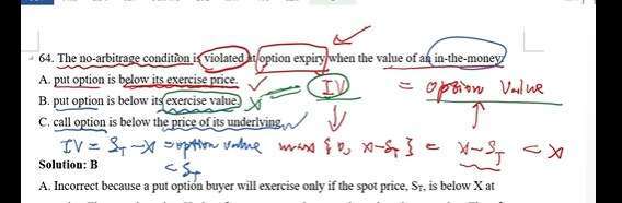 而B说,ITM put的价值小于执行价值(=内在价值),这个不对,应该把B的below改成the same
