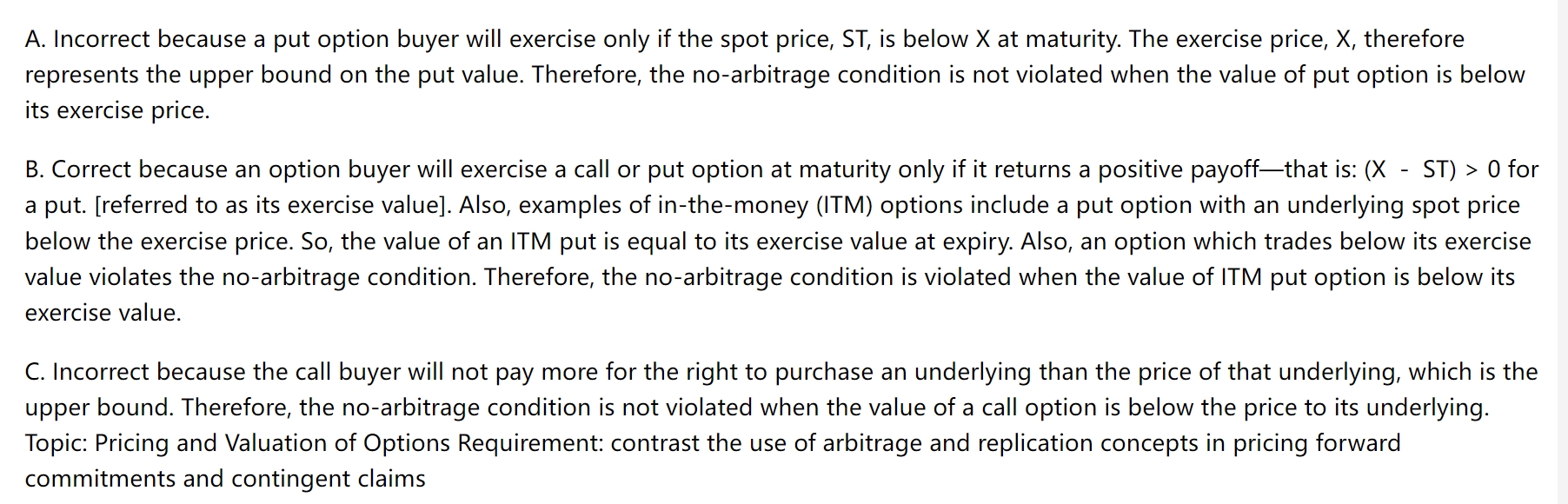 老师我还是没懂,首先题目问的put option和call option就直接默认代表其option的价值吗?A选项我可以理解为put option的价值位于0到X之间,所以不违反无套利;B的exercise value看作是intrinsic value,那option的价值应该等于exercise value,所以题目中说小于因此有套利对吗;C中option低于标的资产价,是因为call行权时是标的资产价格低于option才行权?但是也没说是买call还是卖call啊,那我不知道怎么才是对我赚钱的啊