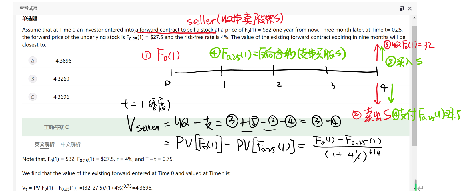 计算(期货估值不考,因为逐日盯市的每个结算日期货价值归零,CFA不考)请参考以下例子,求远期合约价值,截图过程和视频解析: