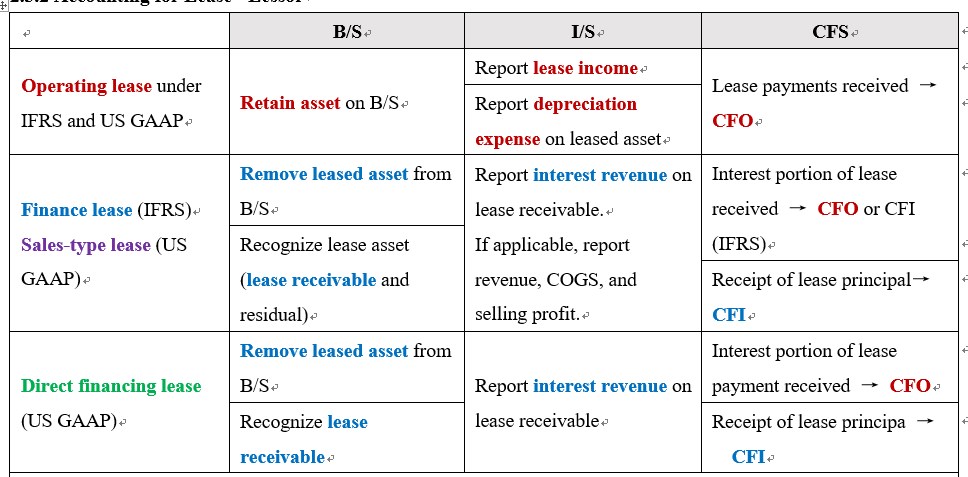 老师我想问有关融资租赁和经营租赁:如果是融资租赁,lessor是确认收入=交易的价格,COGS=carrying value?并且不确认在B/S中,只计应收,不用折旧;如果是经营租赁,则计折旧,确认收入?那么lessee跟lessor一样吗?还要分GAAP和IFRS吗