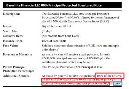 到期时支付的“额外金额”等于标准普尔500医疗保健精选行业指数(SIXV)的100%回报(超过SIXV当前现货价格5%以上)或零的较高者。