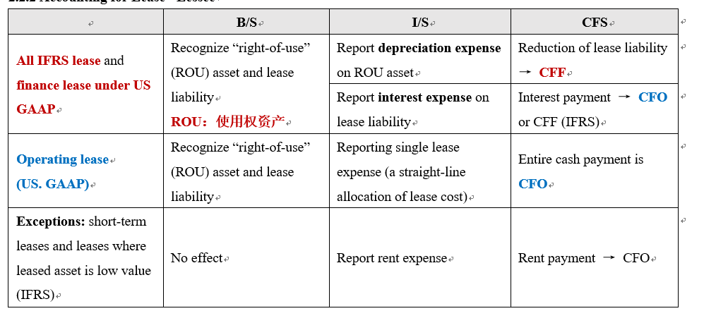 租赁中,更多是考察lessee,IFRS不区分融资租赁和经营租赁,统一按照融资租赁的方式进行会计处理。US GAAP会进行区分融资租赁和经营租赁。IFRS和US GAAP的融资租赁,方法是一样的。US GAAP 经营租赁是另外的一种方法。具体会计处理见截图。