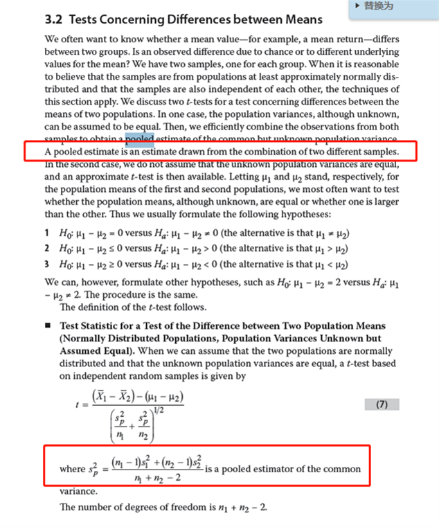 A pooled estimate is an estimate drawn from the combination of two different samples.(原版书原话)