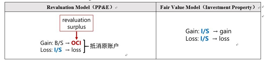 对于长期资产,无论固定还是无形,都有两种方式:cost model 和revaluation对吗? 对于投资性房地产,也有两种计量方式:cost model 和 fairvalue 对吗? 两种区别是,fair value 浮盈浮亏都进入利润表.而低于长期资产,gain是进 OCI 的.