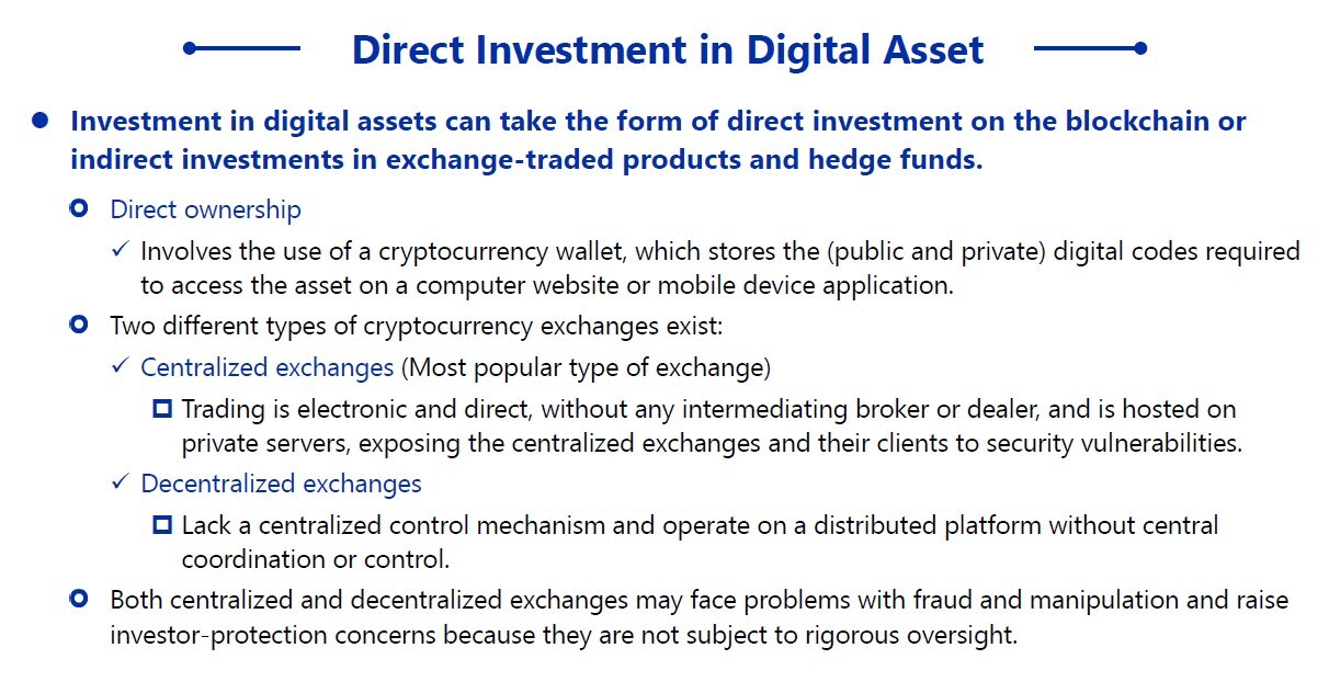 同学你好。在数字资产投资方式中有介绍,加密货币存在两种不同的交易方式,即中心化交易所和去中心化交易所。