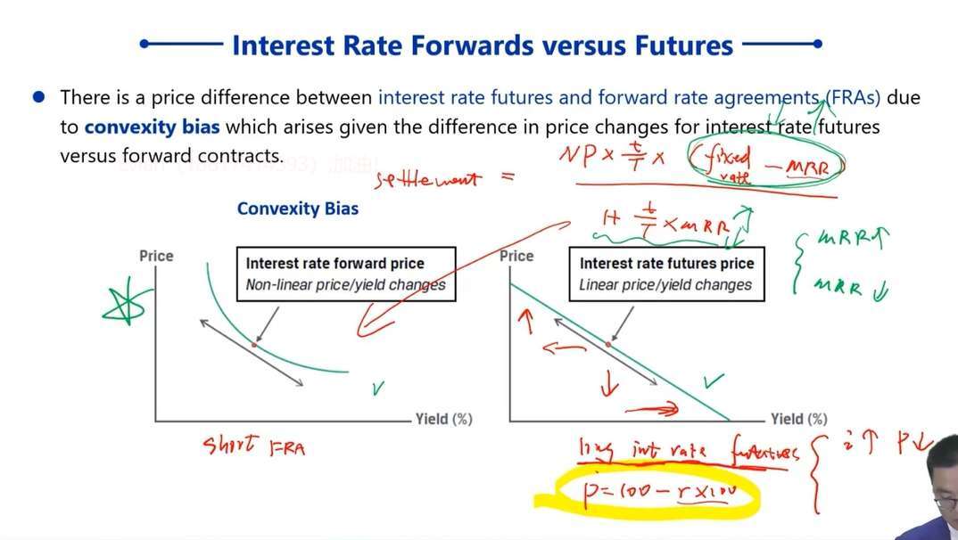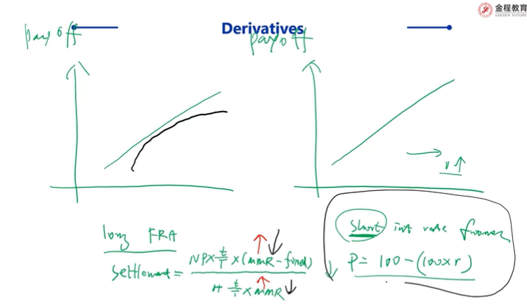 老师好,请问这一部分,如果那条long 利率期货的线条是用100-100*MRR的公式计算,那这个公式和settlement的公式是什么关系?并且如果是short利率期货斜率是大于零(向上倾斜)应该怎么用100-100*MRR解释呢