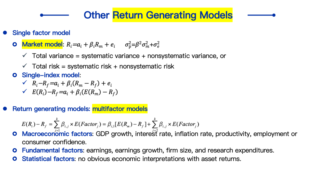 这个是Return generating models: multifactor models? 怎么感觉像是Market model 市场模型?这里的α是什么意思? 另外 market model和 CAPM 的区别是什么? 好在哪里? 在 market model中的α考虑, 在 CAPM 中这部分风险不考虑的吗,还是在其他参数中考虑了