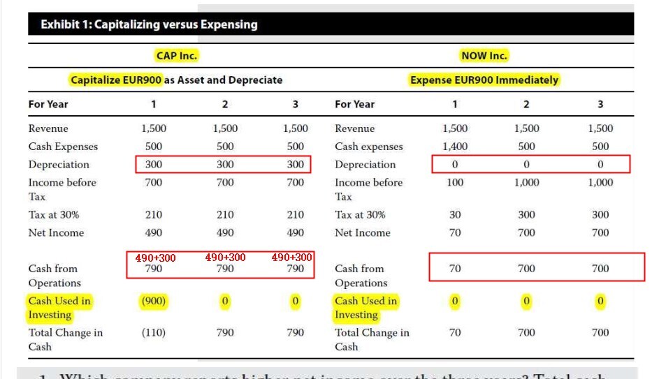 根据本页PPT的CFI知识点的讲解,我的提问是:书P410-Example 3-1. Exhibit 1,这900块钱用于购置固定资产的支出,为什么在CAP公司下算作CFI?而在NOW公司下不算作CFI?CAP公司是将这900块钱资本化,为什么记入CFI?NOW公司是将这900块钱费用化,为什么不记入CFI?2.第1问,为什么Neither company reports higher total net income or cash flow over the three years?CAP 3年的net income都是490,NOW 3年的net income分别是70,700,700 为什么不能比较大小?NOW后两年的net income不是比CAP高吗?3. 为什么说CAP reports higher cash from operations by an amount of EUR900?Exhibit 1表格中,两家公司的cash from operations,差额并不是900?790-70=720,790-700=90。4.note中的这句话也没看懂,怎么理解absent the assumption of zero interest on cash balances, expensing the EUR900 would have resulted in higher income and cash flow for NOW because the lower taxes paid in the first year (EUR30 versus EUR210) would have al owed NOW to earn interest income on the tax savings.