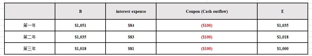以截图第一年为例,会计上利息费用是84,但实际支付的现金流是100,所以现金流实际减少100,但NI里只扣减了84的利息费用,所以还需要额外减去16,这16就是amortized premium
