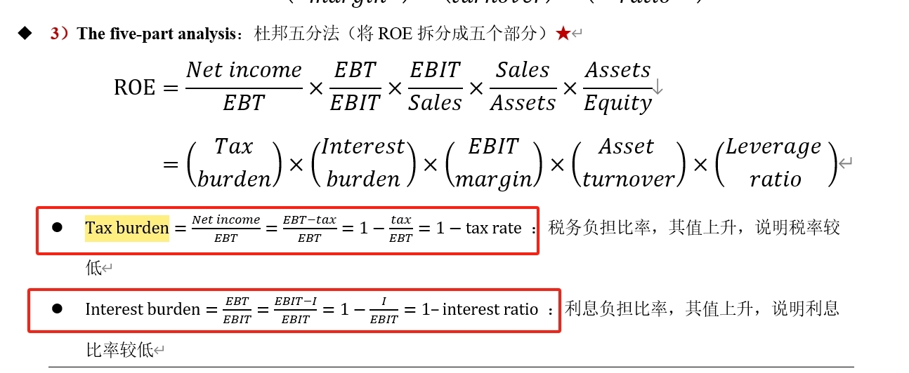 老师,roe的五项相乘其他的都好记好理解,可是一直不太明白为什么ni/ebt和ebt/ebit为什么叫tax burden和interest burden,这应该怎么理解呢? 由其是前者的Ni为分子,