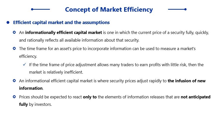 同学你好。如下图,讲的是有效资本市场的定义,市场有效是指资产价格快速、充分、合理的反映所有可获得的信息。