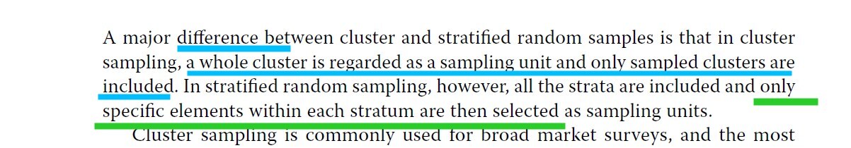 由此可以发现cluster sampling不可以保证总体特征,因为仅有个别cluster抽到了,而剩余的clutter抽不到