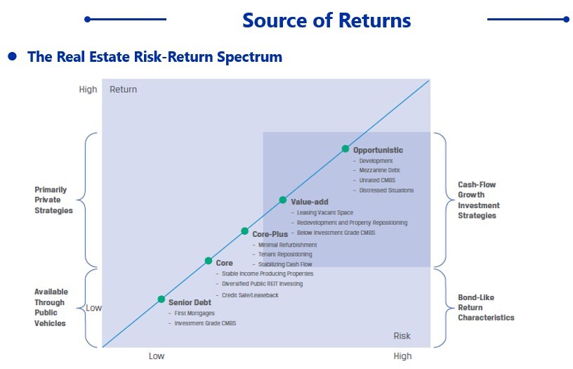 开放式基金通常投资于最佳市场中出租率高、质量好的商业和住宅房地产,也称为核心房地产策略。投资者期望核心房地产能够带来稳定的回报,主要来自房地产收入。像大规模的再开发和现有资产的重新定位是增值房地产策略。最具机会性的房地产策略包括大规模再开发、资产再利用、承接大量空置或推测市场状况显著改善