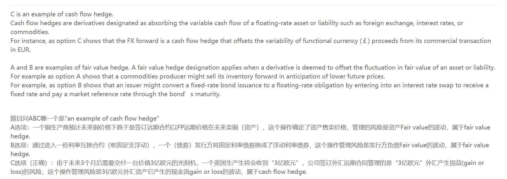 3. 能再讲一下三个hedge的判断方法吗,为什么B是现金流反而算成了fair value hedge了?
