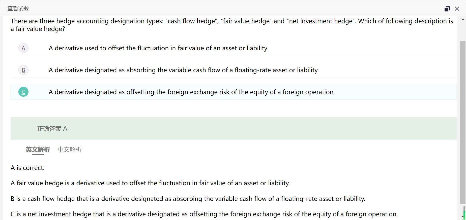 1. C不是收固定吗,也不是支固定啊 2. 为什么c不是net invest hedge 3. 能再讲一下三个hedge的判断方法吗,为什么B是现金流反而算成了fair value hedge了?
