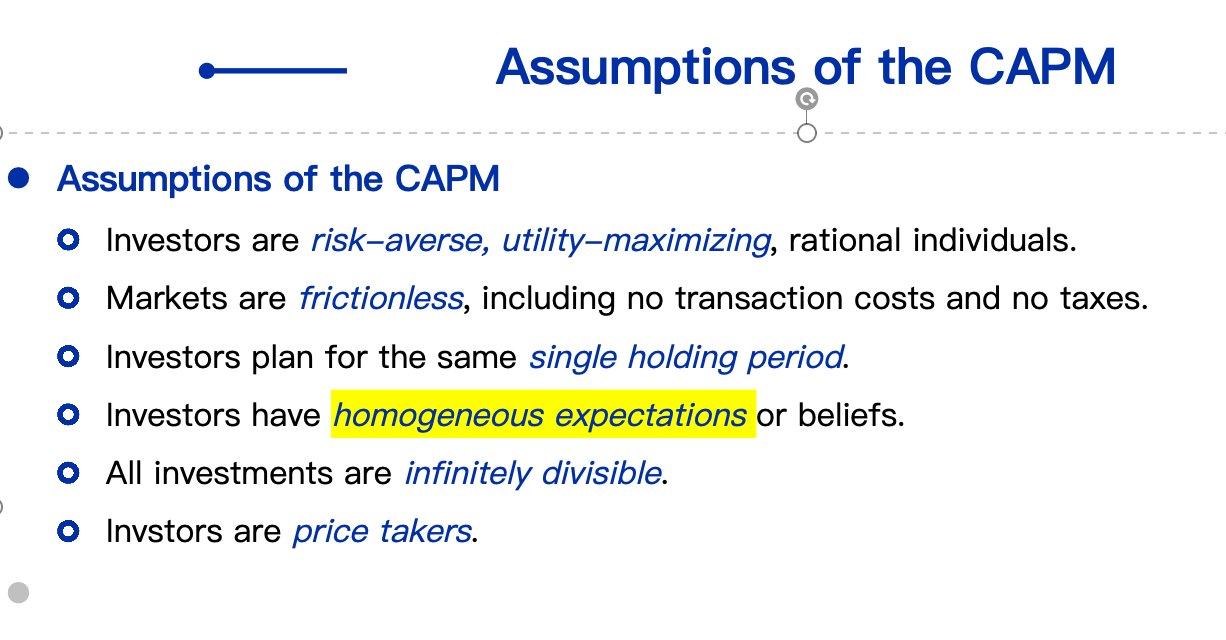 而CAPM假设大家对未来有着相同的预期,即homogeneous expectations