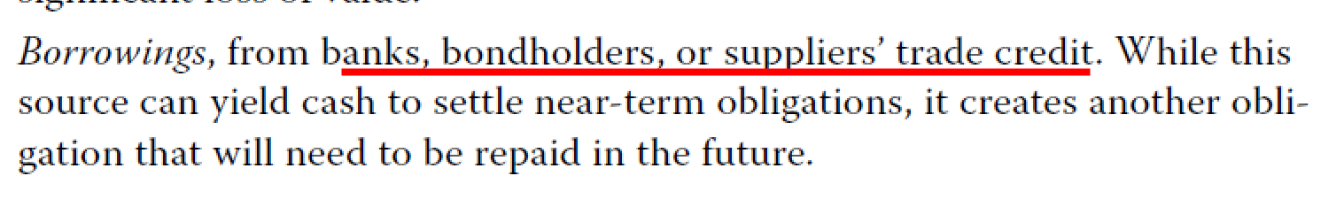 C. 这个选项属于borrowing。borrowing除了为银行和债权人借的钱之外,还包括供应商给的trade credit,也就是允许晚点付钱。那么压在账期最后一天付钱相当于是之前一段时间都在问供应商借钱没还。
