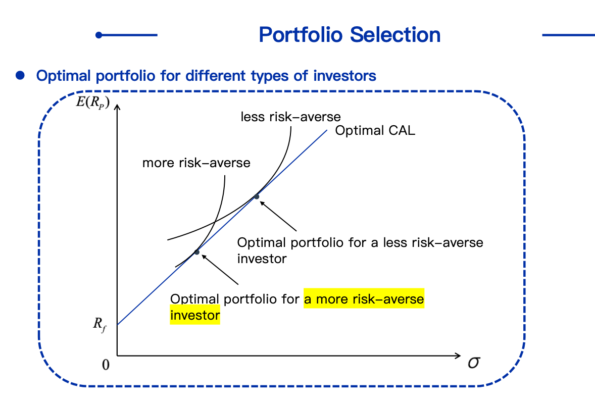 表明他选择optimal portfolio的时候不愿意为了更高收益去承担更多风险,此时他的optimal portfolio对应的切点在图像中位置更靠下。无法获得更高的expected return。