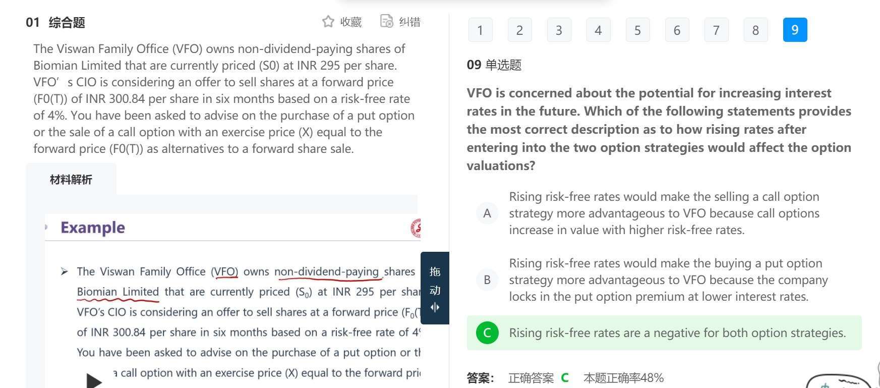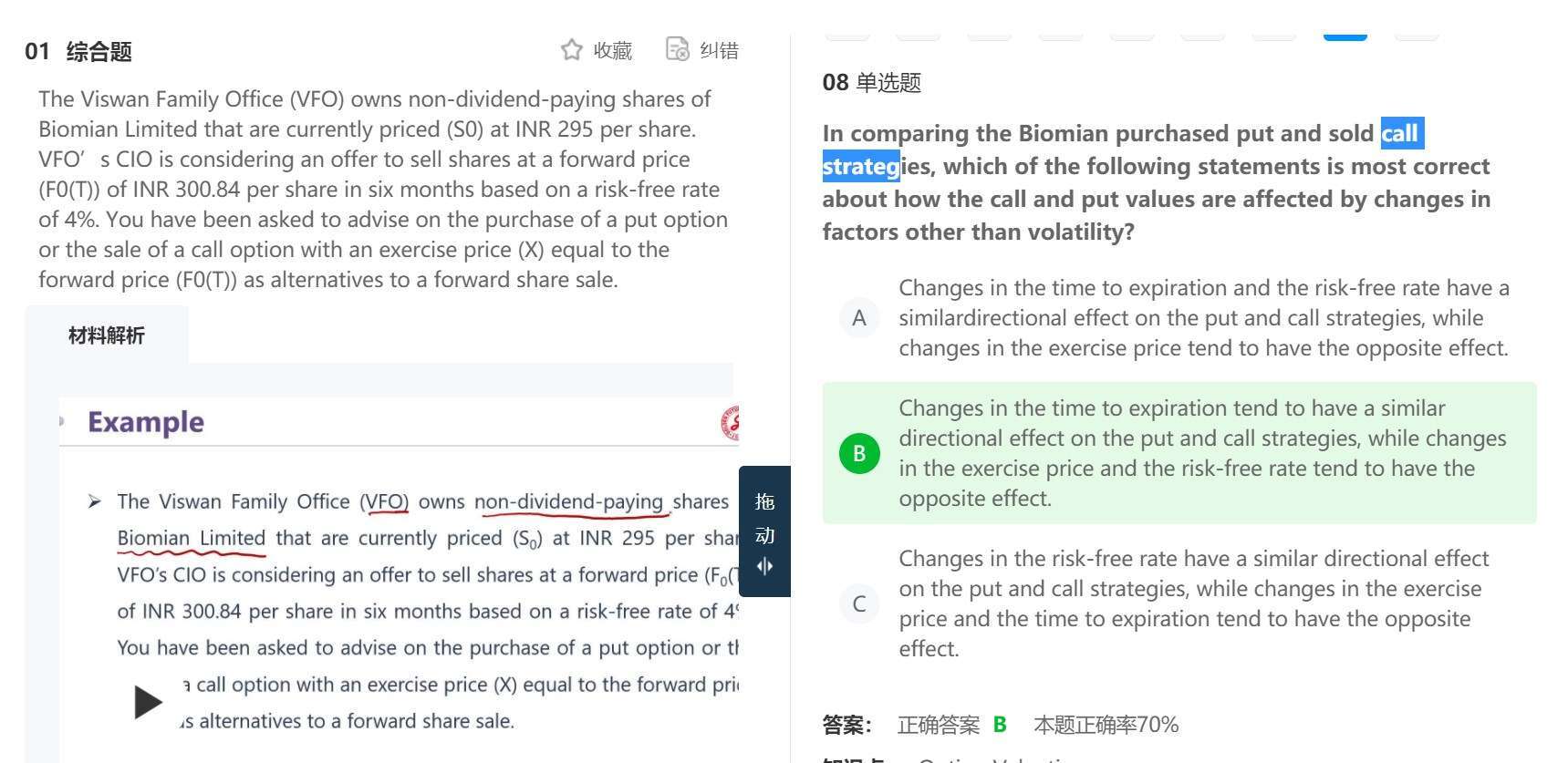 第8和9小题 在考虑call和put的价值影响因素 不需要考虑前面策略说的purchased put and sold call吗? 前面已经说了是sold call,那时间对于seller是有益的 buyer是消耗 所以影响方向并不相同 。 视频答疑完全没提到策略 就单纯在考虑call和put本身的影响因素