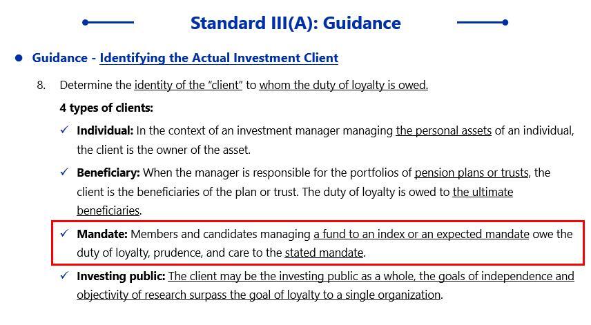 当managing a fund to an index的时候,基金经理应该是确保投资与基金的mandate保持一致,而不是与shareholders。mandate才是fund真正的客户