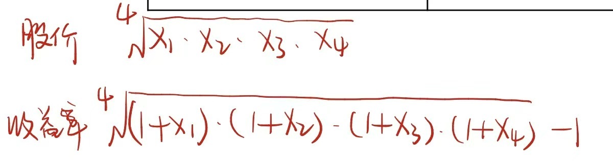 几何平均数的公式如下图2所示,如果是价格数据算几何平均数用图2上面的式子,如果是收益率数据算几何平均数用图2下面的式子。