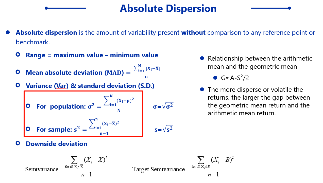 同学你好,方差计算的公式如下图1所示,我们拿总体方差来举例,下图1相当于赋予了每一项Xi相同的权重,都是1/N,即1/N*(X1-X bar)+1/N*(X2-X bar)+1/N*(X3-X bar)+...1/N*(Xn-X bar)