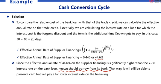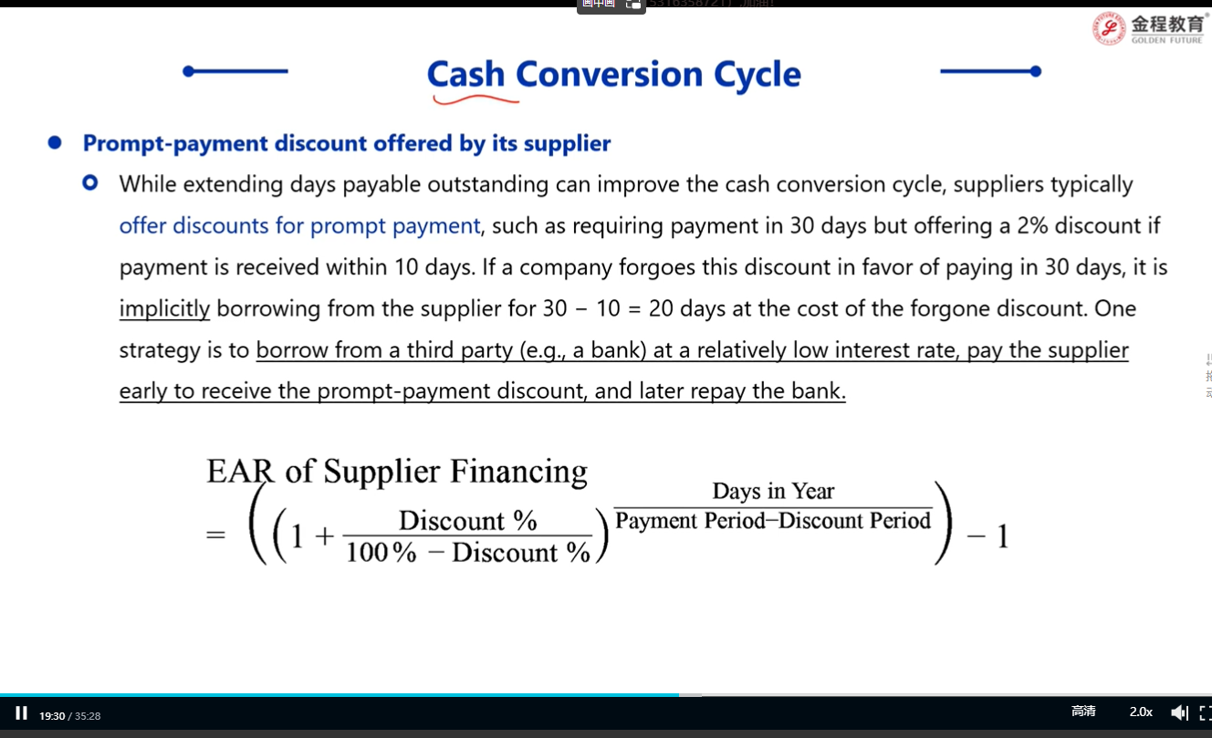 这个知识点在Working Capital and Liquidity这个module的Cash Conversion Cycle部分。建议同学去回顾下Cash Conversion Cycle这节基础课,有对这个公式的详细讲解以及配套例题的讲解。