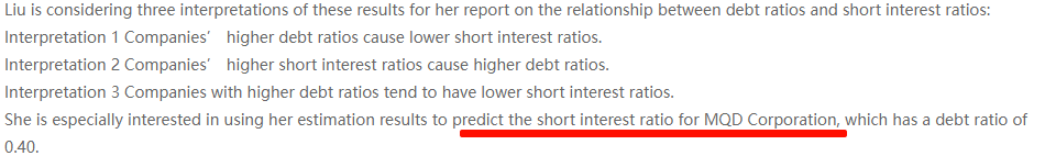同学你好,MQD corporation是这家公司的名字。分析师现在想要去预测MQD corporation这家公司的short interest ratio这个指标,所以这个就是因变量,在回归模型中因变量的预测值我们用Y cap来表示。