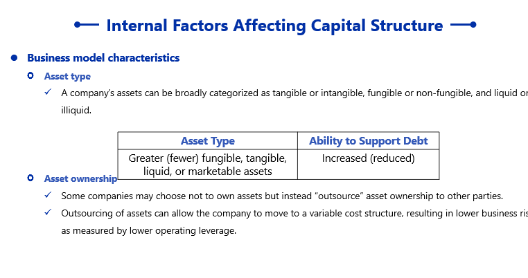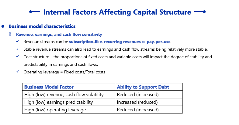 同学你好,这个题目考察的是影响一家公司的资本结构的因素。具有以下特征的公司更有能力去承担债务。讲义如下