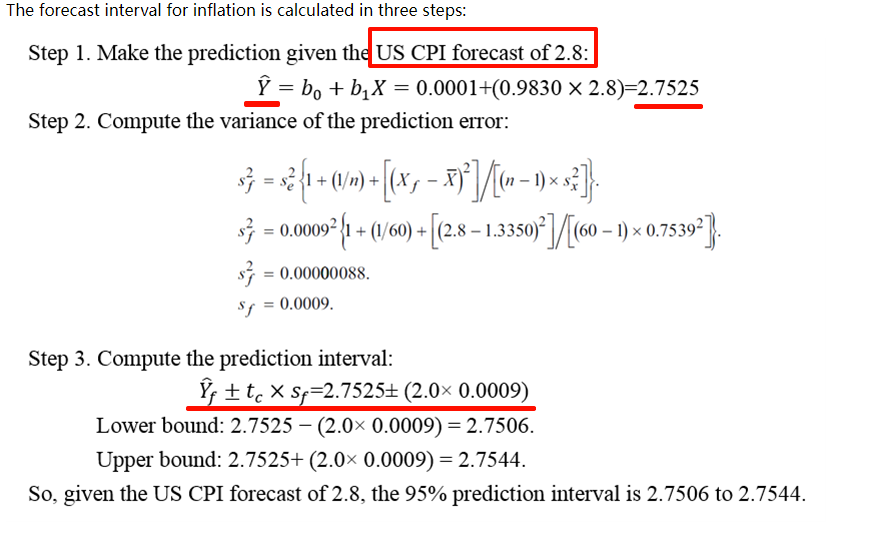 点估计就是Y cap的计算值2.7525,关键值就是题目给的95%置信区间关键值是2.002,因变量标准误的计算有点麻烦,就是step 2的公式,这个不需要掌握,原版书现在没有这个公式了,但我们假设计算出来0.0009。最后代入置信区间的公式即可。