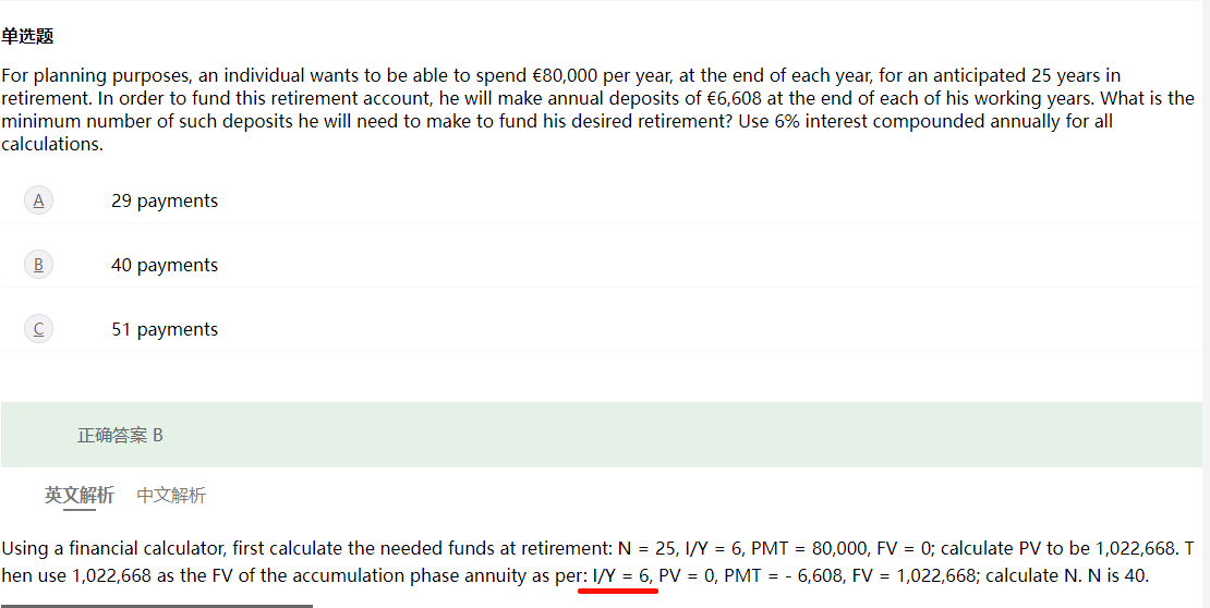 考虑吃利息的问题了,划红线的地方I/Y输入6%,意味着这40年每期投入6,608,这些钱在账户中每年按照6%利率再投资,到退休时才能满足1,022,668的金额。