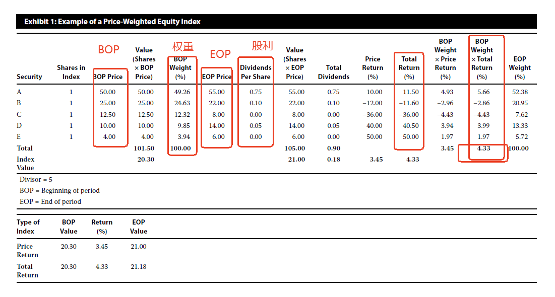 我们可以以下面这个指数为例。这是一个5个成分股构成的price-weighted index。每个成分股的total return=[期末价格(EOP)-期初价格(BOP)+每股股利]/期初价格(BOP)