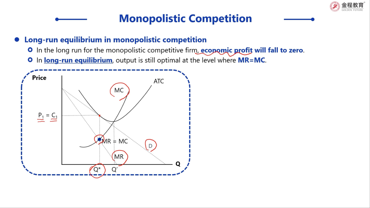 因为长期中长期中垄断竞争市场的经济利润为零,还需满足MR等于MC的利润最大化条件。