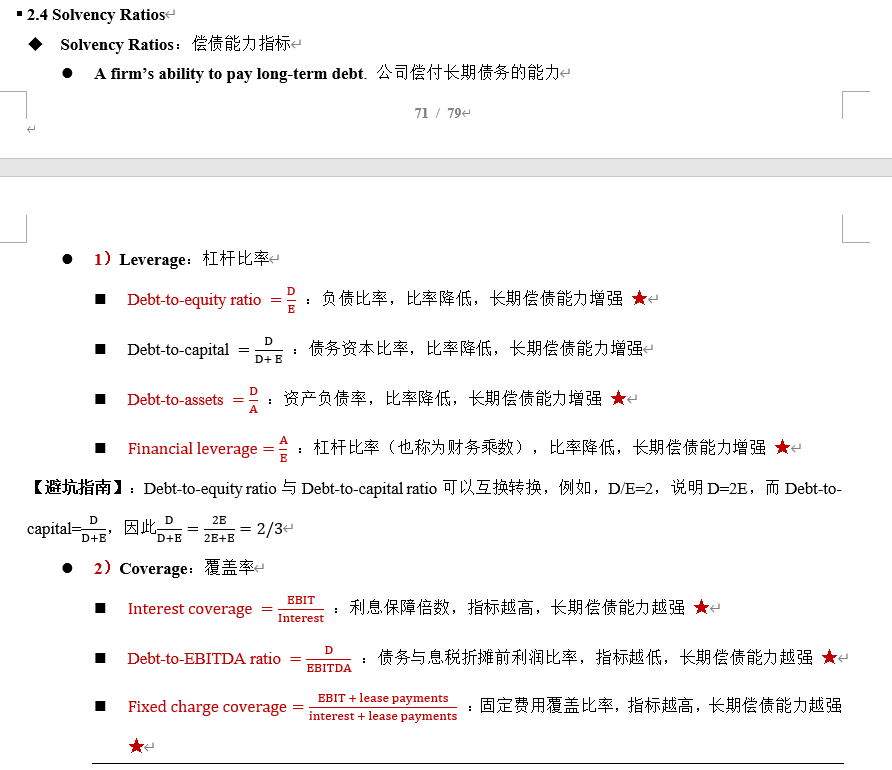 偿债比率分为leverage ratio和coverage ratio。D/E这些是leverage ratio