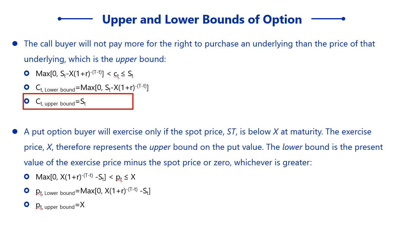 同学你好,欧式看涨期权价值的上限是标的资产的价格,因为如果看涨期权的期权费高于了标的资产,那么投资者就不会买期权了,会直接买标的资产。