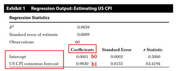 同学你好,在回归表格里,intercept对应的coefficient系数是b0,下面数字0.9830就是斜率b1的回归系数,这个数字左边对应的内容就是自变量X,即US CPI consensus forecast。