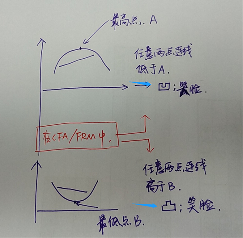 FRM中对于凸凹的定义与理解和大学中课本讲的有所不同,恰恰是反过来的记忆,FRM中的凸凹有两种思路记忆理解,请参考附图。