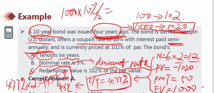 10年期的债券,4年前发行,那么还剩下6年,且半年付一次息,那么接下来还有12期(6*2),即N=12