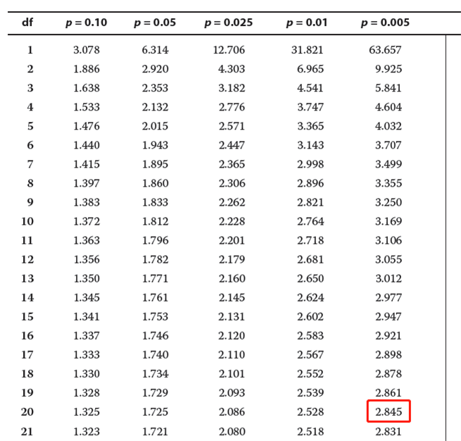 例如第一个,99%的置信区间下,df=20,Critical value= reliability factor=2.845