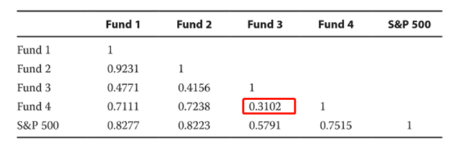 r指的是样本与样本的相关系数,在以上的截图中,Fund 1 和 Fund1 自己的相关系数就是1,而Fund3和Fund4的相关系数就是0.3102(很多软件可以计算的,最常见的是Excel,只要给定两组数据,在指定的运算下可以计算出来)