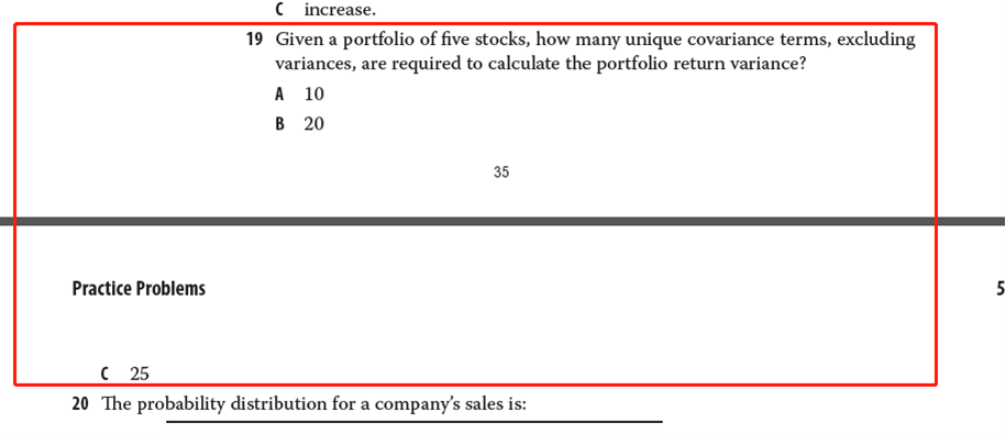 本题考查的知识点是“协方差矩阵”,题目大意:“如果一个投资组合里包含有5只股票,除了方差项,在计算组合方差时,有多少个特有的协方差项”请参考附图。其中,协方差是关于表格的对角线对称的,例如COV1,2和COV2,1是相同的,所以算一个,不是两个。