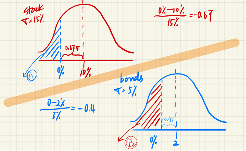 因为0%距离均值,A比较远(0.67倍标准差)B比较近(0.4倍标准差),所以A的面积是小于B的面积