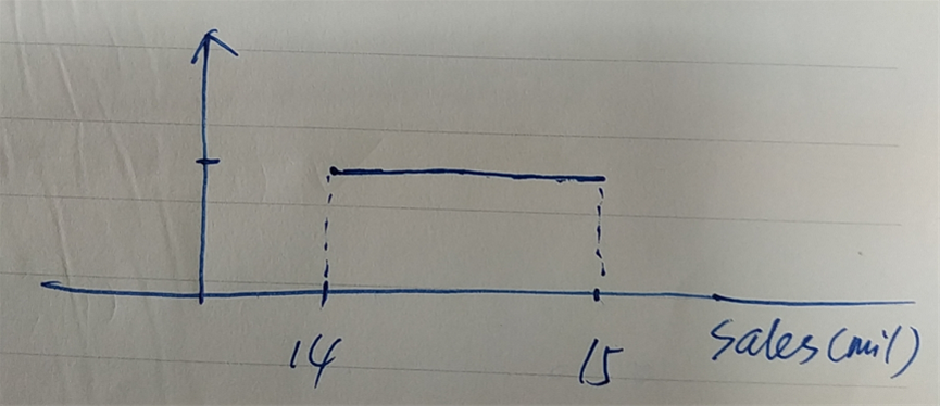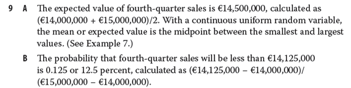 You are forecasting sales for a company in the fourth quarter of its fiscal year. Your low- end estimate of sales is €14 million, and your high- end estimate is €15 million. You decide to treat all outcomes for sales between these two values as equally likely, using a continuous uniform distribution. A What is the expected value of sales for the fourth quarter? B What is the probability that fourth- quarter sales will be less than or equal to €14,125,000?