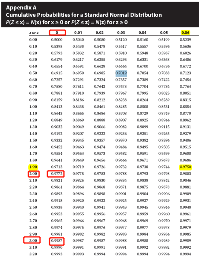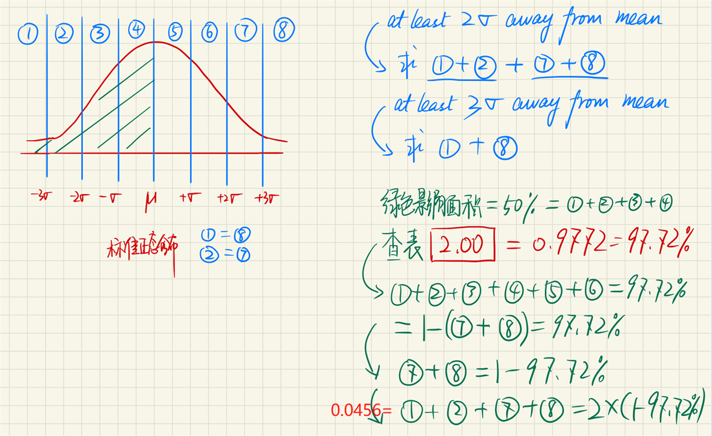 应该查标准正太分布的累计概率表“Cumulative Probabilities for a Standard Normal Distribution”,从0.000对应0.5000表示的是均值右边0倍标准差的面积是50%,3.000对应0.9987表示的是均值右边3倍标准差的面积是99.87%=①+②+③+④+⑤+⑥+⑦